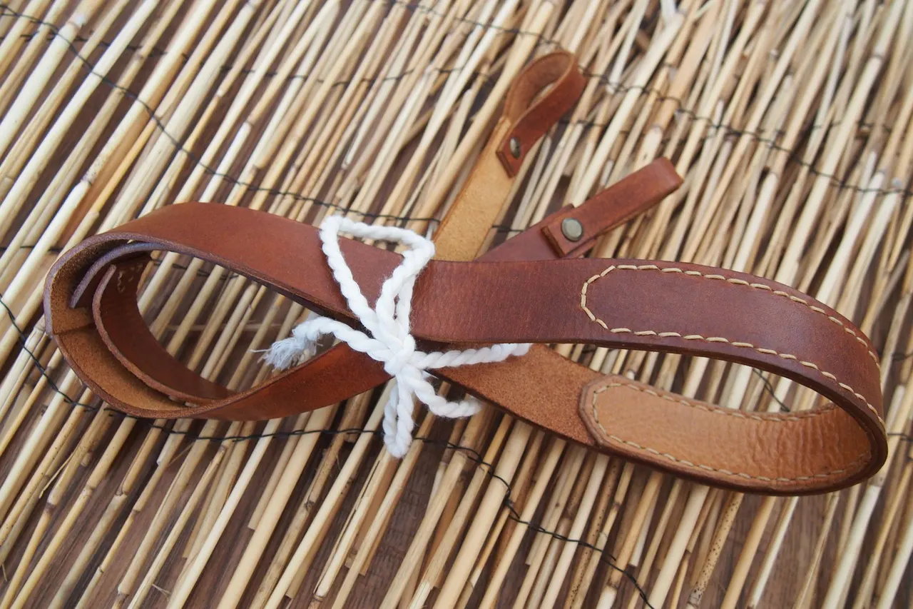 Nowy pasek do aparatu. Skórka bydlęca garbowana roślinnie, z wierzchu farbowana na brązowo i zabezpieczona naturalnymi olejami i woskami. Od spodu miękka skórka z bydlęcego karku (z miejsca, gdzie się zginała). Obrabiana tylko naturalnymi i mechanicznymi metodami, żeby nie powodowała uczulenia przy długotrwałym kontakcie z gołą skórą. Przeszycia wykonane ręcznie. Nity skręcane (montaż do aparatu po odkręceniu) w kolorze stary mosiądz. Pasek prosty i minimalistyczny.