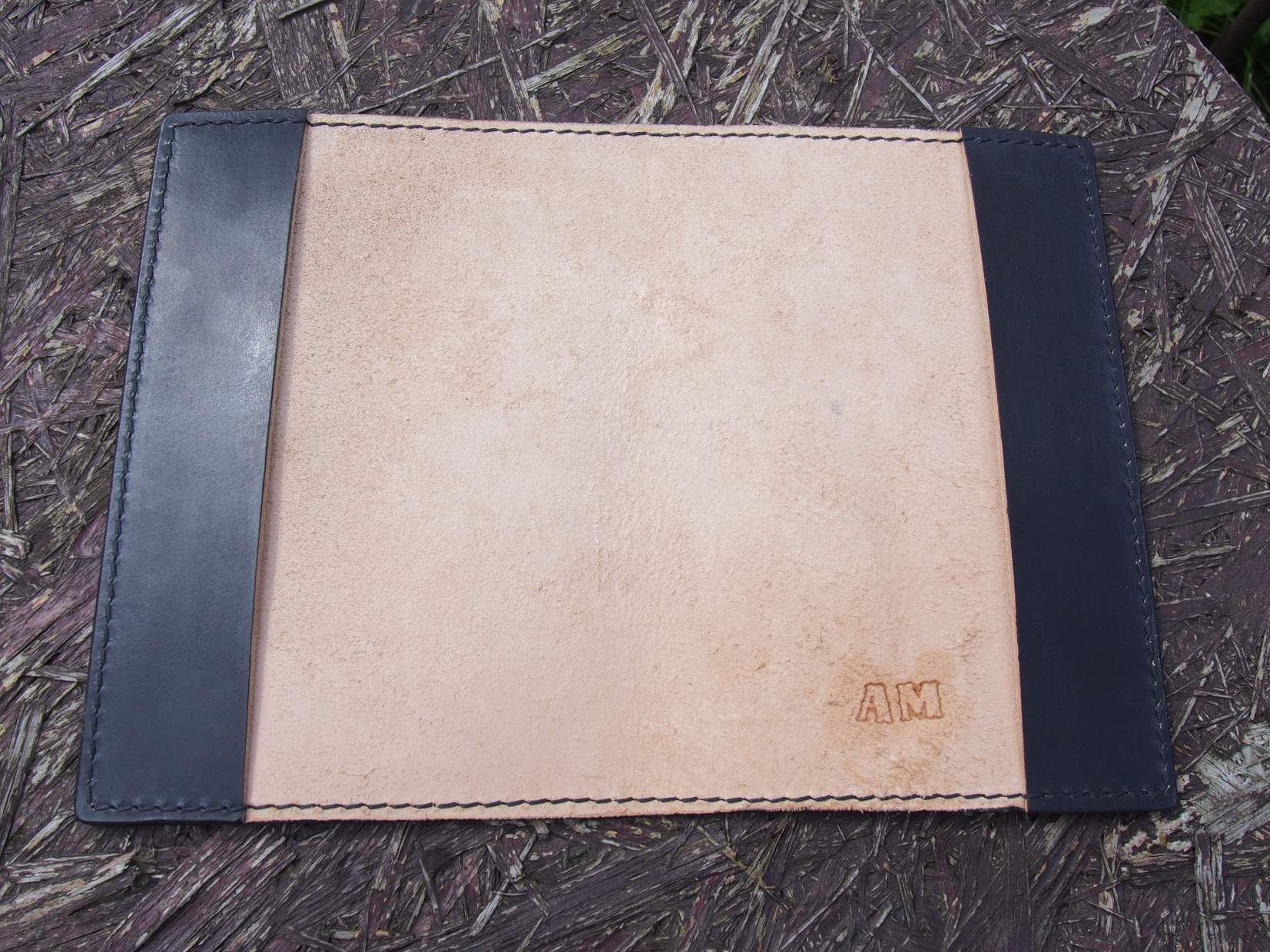 W rogu wytłoczony na gorąco znaczek Warsztatu Domowego. Od wewnętrznej strony, tym samym sposobem umieściłem inicjały.