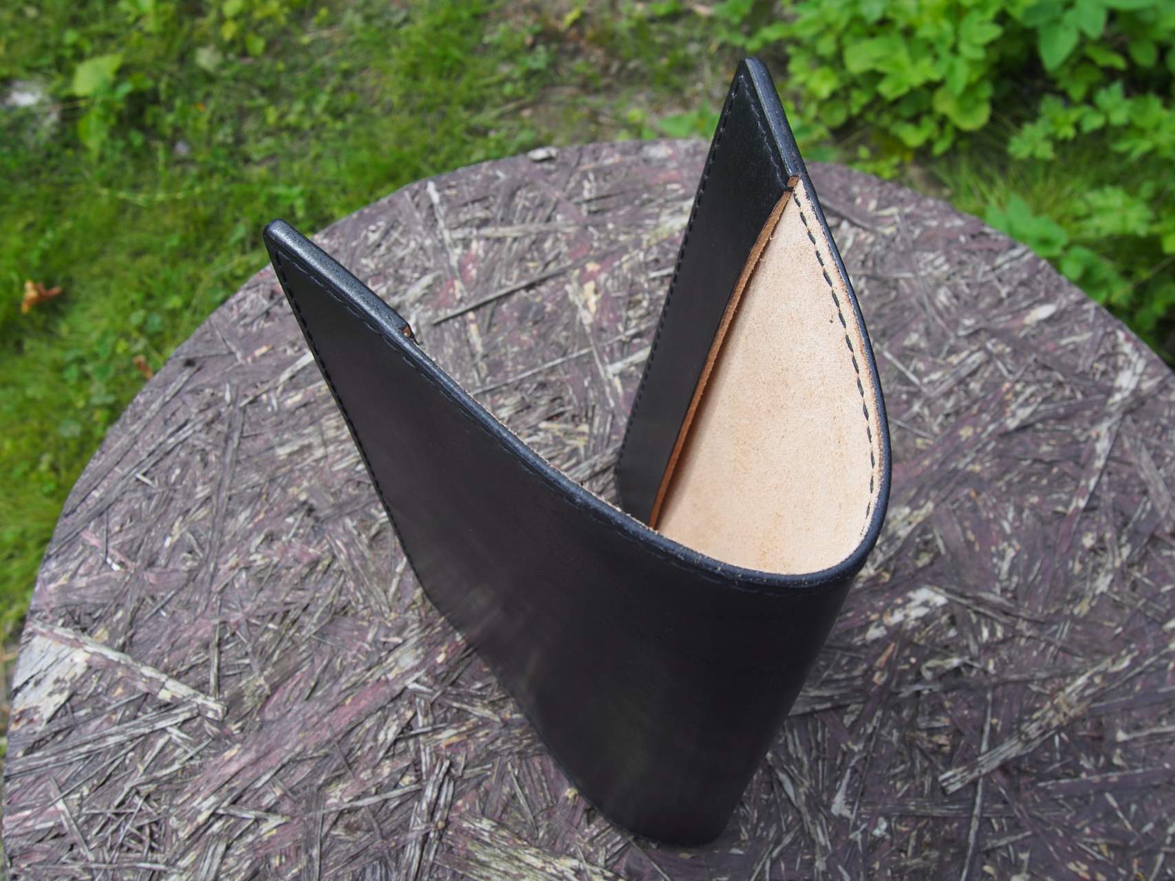 Skóra bydlęca garbowana roślinnie grubości ~3mm, cięta z połówki bliżej boku. Z rodzimej garbarni. Najpierw pofarbowana Eco-flo Water Stain. Następnie mieszanka olejowo-woskowa, powoskowana na gorąco miksem pszczelego i carnauba, na koniec balsam Palc dla ładniejszego połysku. Skóra miała kilka naturalnych zagniotek, moim zdaniem ładnie odbijają one światło, dzięki temu gładka okładka nie jest nudna. Czarne na czarnym, ale jednak coś się na niej dzieje.