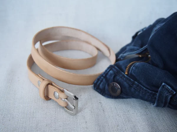 Na pierwszy ogień idzie wąski pasek do spodni. W stylu casualowym i minimalistycznym. Przedmiot wykonałem ze skóry garbowanej roślinnie grubości około 3mm.  Jak na wąski pasek damski, to 3mm jest trochę powyżej średniej, ale całkowicie standardowo dla pasków o większych szerokościach. Myślę, że optymalny wybór pomiędzy wytrzymałością i smukłością wyglądu. Przy tak małej szerokości, grubsza skóra powodowałaby, że pasek wyglądałby kwadratowo.