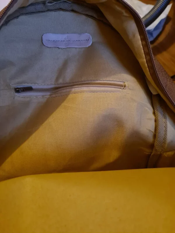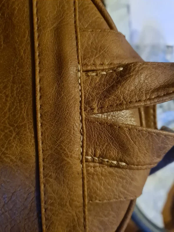 Poniżej zdjęcia z naprawy plecaka z tzw. ekoskóry, czyli po prostu poliuretanu imitującego skórę – zrobiona dla Mamy tylko chyba po to, by przekonać się, czy naprawdę nie ma to sensu. Ukrycie starych wystających nici, przygotowanie skórzanej podkładki o tym samym rozstawie dziurek 3mm, ponowne przeszycie ręczne z wjechaniem na szelki (z jednej strony się pruło, z drugiej dla symetrii) – to wszystko zajęło prawie godzinę. Ale to nic – największy problem to zachowanie poliuretanu, który rwie się przy przeciąganiu igły. Nie można mocno zaciągnąć nici, bo jest mocniejsza niż ten badziewny materiał i przecina go. Nie da się prawie zrobić równego szwu, bo materiał rozciąga się i pruje. Po zakończonej pracy człowiek zastanawia się, ile jeszcze wytrzymają te wiotkie szelki.