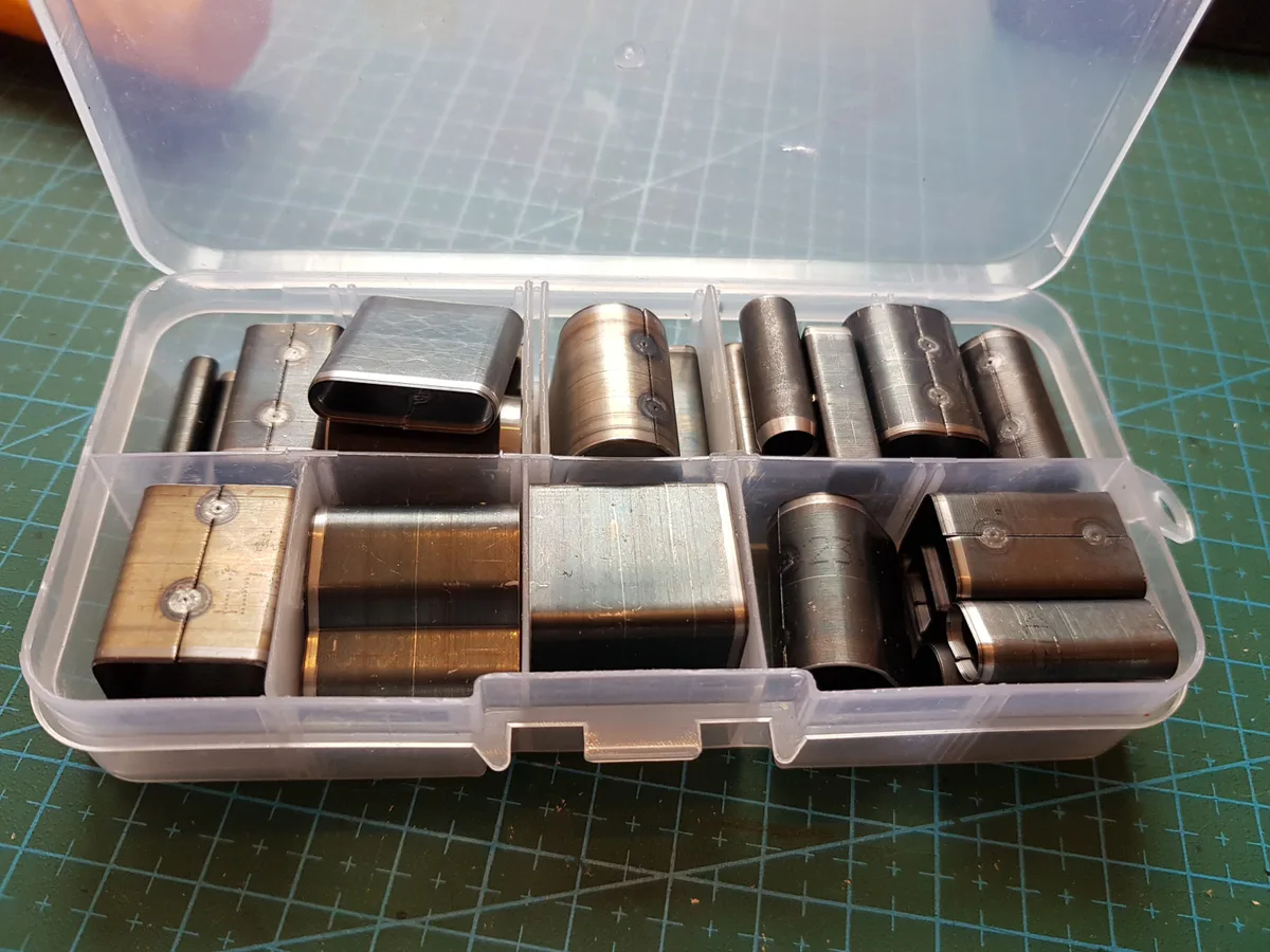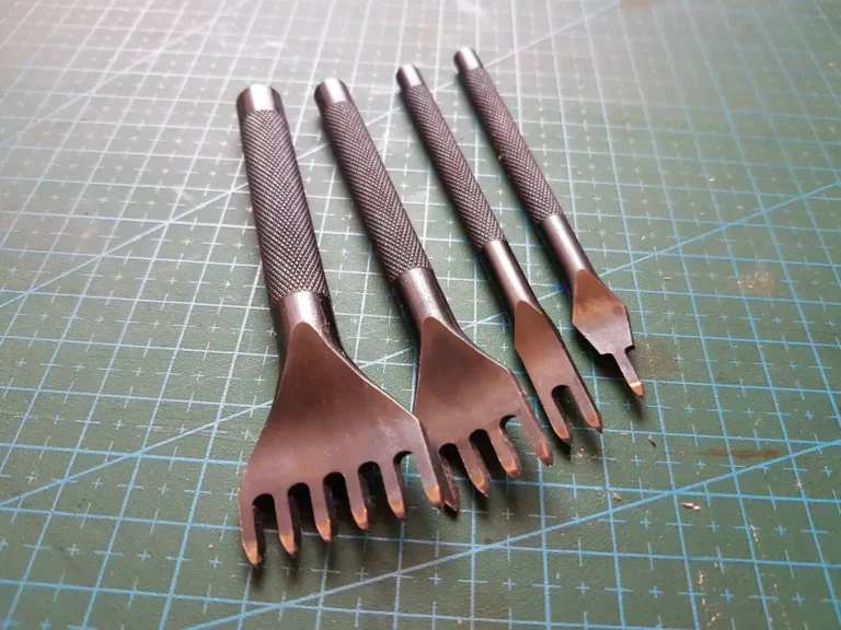 Fajny zestaw. Fabrycznie były nawet ostre. Są na tyle mocne, że wytrzymują spotkanie z większym młotkiem. Zwłaszcza ten do dziurek pod język klamry dostaje w kość. Najczęściej robi otwory w skórze grubości 5mm, tej od pasków „Na całe życie”. Jak widać, dziurkacze są zrobione z zaginanej blachy naostrzonej z jednej strony. Cieszy fakt, że tam gdzie końce blachy się stykają i są zespawane/zgrzane nierówności wystarczająco małe, żeby nie było widać po nich śladu na wycinanych elementach skórzanych. Mogłyby być trochę wyższe, trudniej byłoby wtedy o przywalenie sobie młotkiem w palec. No ale nie można mieć wszystkiego, trzeba albo uważać, albo stosować jakieś trzymadło, albo przestać żreć i schudnąć w palcach…