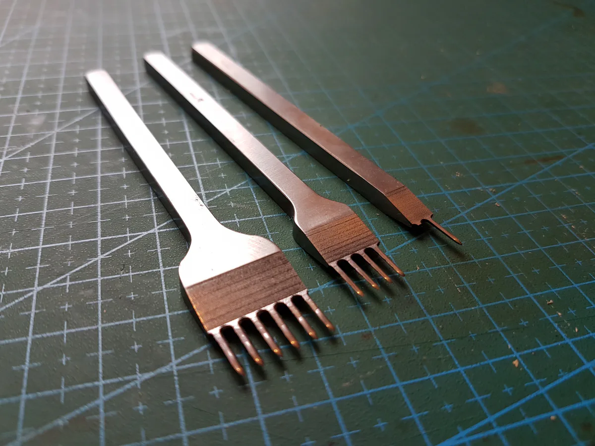 Bardzo były mi potrzebne wybijaki o takim pośrednim rozmiarze. Miałem wcześniej 3,85mm od WUTA oraz 6,5mm od IVAN. Po zakupie tych z WUTA, za ponad 300zł, nie chciałem dużo inwestować. Długo szukałem, aż spośród takich samych, czarnych wybijaków wybrałem właśnie te. Patrzyłem na cenę i liczbę komentarzy zawierających wzmianki o krzywych zębach. Bo jeśli trafiłby się felerny, to prostowanie może zakończyć się złamaniem elementu. Mój zestaw był bez zarzutu, co do równości zębów. Musiałem je tylko naostrzyć, o tym, że będą tępe wiedziałem z komentarzy. Pół godziny z kawałkiem skórki natartej pastą polerską i w końcówkach zębów zacząłem widzieć swoje odbicie. Uchwyt jest wygodny, dzięki nacięciom się nie ślizga. Załączam porównanie szwów. Jakby ktoś się zastanawiał po co kupować wybijaki z WUTA, to już wyjaśniam – wygoda użytkowania i możliwość stosowania cieńszych nici. Przy tych tanich wybijakach, dziurka nie zamyka się tak dokładnie wokół nici, nawet po przyklepaniu młotkiem, poza tym te z WUTA dużo łatwiej się wyciąga ze skóry, nawet wbite do oporu. Mniejsze ryzyko rozciągnięcia materiału. Co ciekawe, dziurki zrobione wybijakami WUTA łatwo się przeszywa nićmi do 0,6mm, ale 0,8mm jest jeszcze całkiem akceptowalne. 1mm ciężko przeciągnąć i już zaczyna głupio wyglądać, przy tak małym rozstawie. Różnica między tymi za 30zł i tymi z IVAN jest już mniej zauważalna. Szew i wygoda użytkowania są podobne. Tak samo ciężko je wyrwać ze skóry. IVAN był fabrycznie lepiej naostrzony, ma też malowaną powierzchnię. W sumie daje to tyle, że ładniej wygląda, no i ma nazwę wypisaną białą czcionką. Gdyby nie te kosmetyczne różnice, to te z IVAN mogłyby się sprzedawać za 30zł/komplet byłyby poza podejrzeniem o „markowość”.