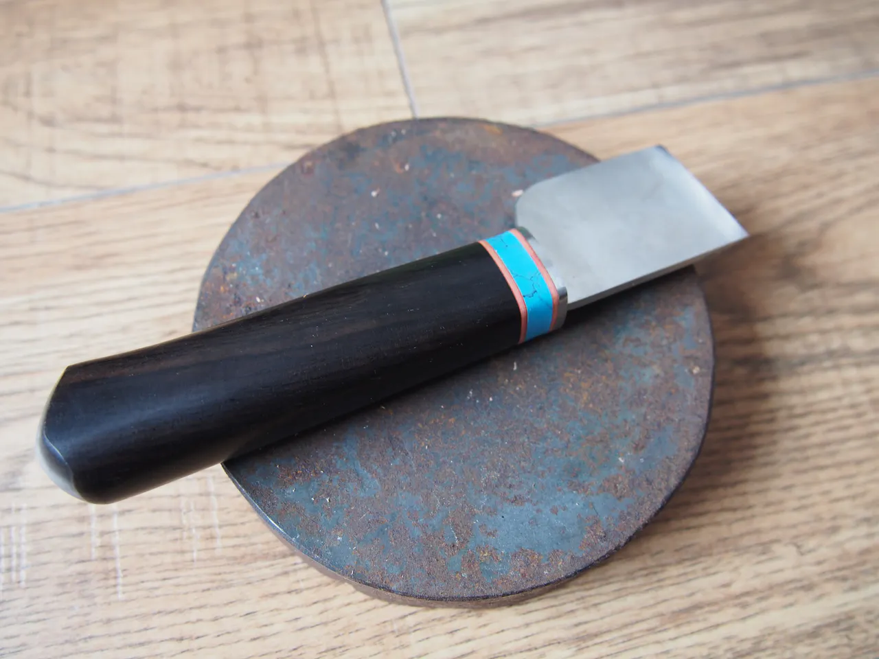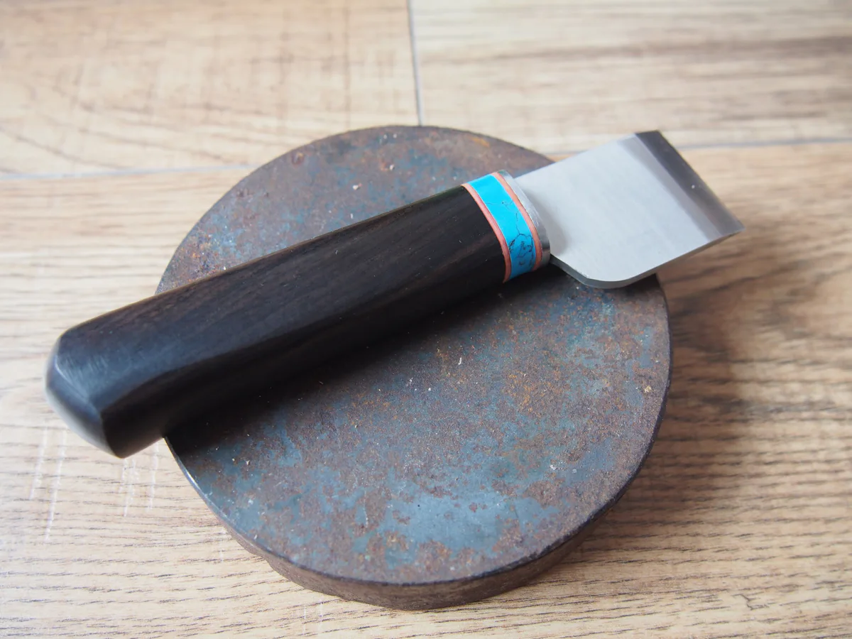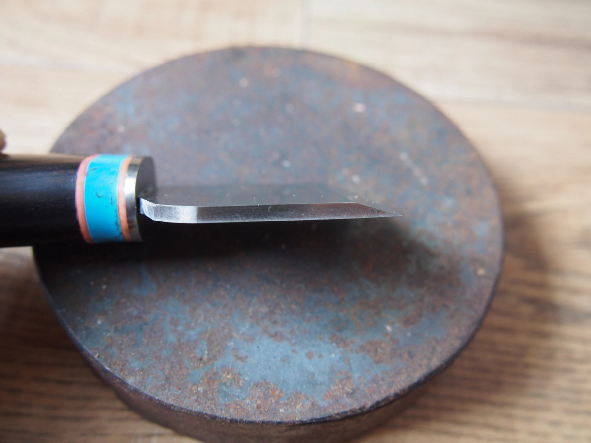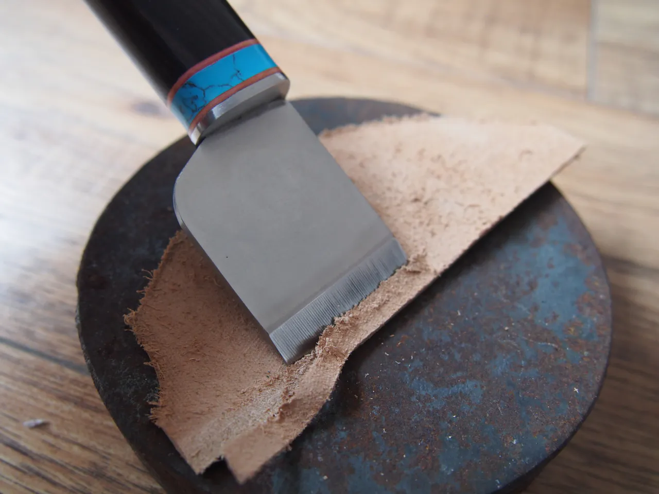 Nożyk jest dość ciężki, super leży w dłoni. Wykonanie dobre, ale za tą cenę, bliskie ideału ;). Minimalna wypływka kleju przy łączeniu ostrza z rączką. Rączka z ciemnego drewna (mahoń?) bardzo dobrze wyszlifowana i sparowana z metalowym zakończeniem i niebiesko – czerwonym zdobieniem. Kiedyś pisałem, że nożyk Olfy łatwo się ostrzy, tutaj dzięki profilowi ostrza jest to jeszcze łatwiejsze. Zachowanie stałego kąta ostrzenia to prościzna przy ostrzu o tej geometrii. Wystarczy równo dociskać jego końcówkę do materiału ściernego. Co ważne nożyk był bardzo dobrze naostrzony już przez producenta, co przy narzędziach z Chin nie jest standardem. W sekrecie mogę powiedzieć, że takich samych obrazków używa WUTA Leather i sprzedaje identyczny lub bardzo podobny nożyk za 170zł. Nie mam jak potwierdzić, że to ten sam model, ale po obrazkach mam 90% pewności, że jednak tak. Może za 56zł wysyłają to, co nie zahartowało się do tych 66HRC? 😉