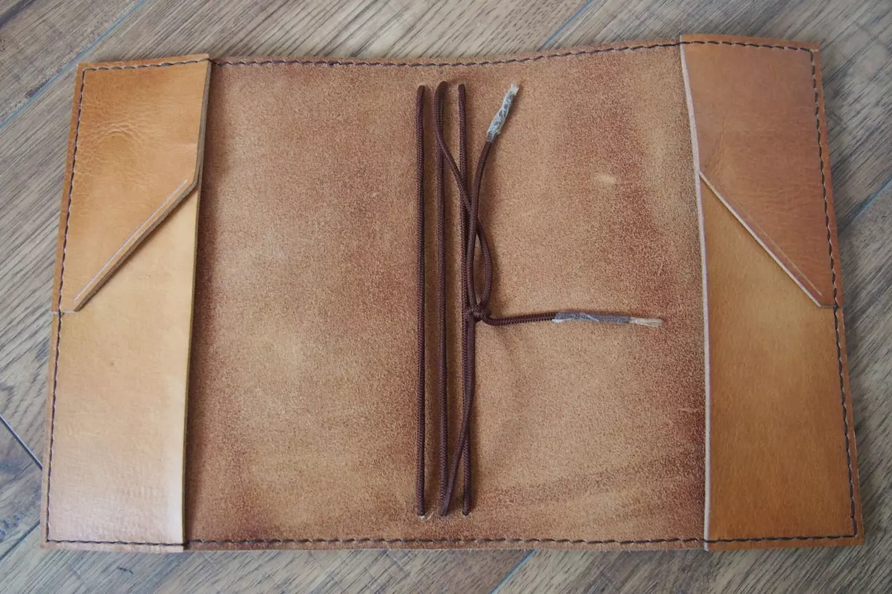 W dziewiątej (liczyłem!) odsłonie okładki… Karczek garbowany roślinnie, lico zabarwione i zabezpieczone tylko olejami i woskami naturalnego pochodzenia. Przeszycie na całym obwodzie solidną nitką, 4 gumki na zeszyty. Dopasowana pod 3-4 notatniki A5 60-80 karetek każdy. Praktyczne kieszonki na bokach. Dekoracje z etui na pióra własnej roboty, pióra Pelikana z lat 60tych i starego notatnika.