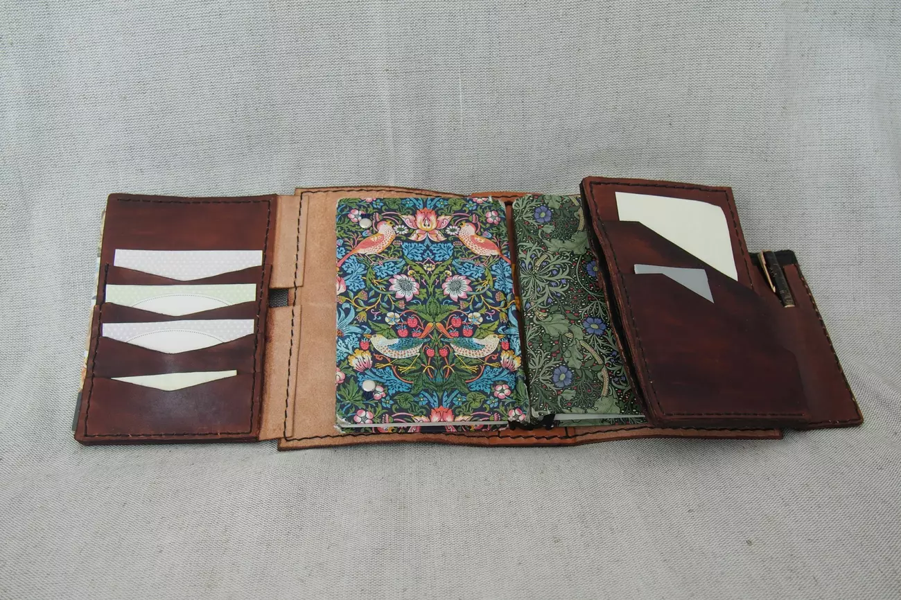 Okładka mieści kilka zeszytów A6, a przynajmniej 3 grube. Do tego liczne kieszonki i zakładki. Jeśli wypakuje się ją po brzegi to ciężka jak cegła 🙂 Projekt inspirowany wyrobami z Apple Pig Leather, no mój gust jest mimo wszystko bardziej yyy minimalistyczny. W każdym razie była to najbardziej skomplikowana rzecz jaką uszyłem, ze względu na liczbę elementów. Z ciekawych rozwiązań mogę zwrócić uwagę na pochewkę na pisadło, tak luźno zamocowaną z boku oraz tą wewnętrzną kieszonkę z klapką (na pasku kilka dziurek w stylu a la brogsy – ostatnio mi się te wzorki spodobały, będą też na jednym z kolejnych wyrobów). Wykonywałem tylko jeden egzemplarz więc kombinowanie z prototypami nie opłacało się, a na papierze i kartonie wszystkich problemów „technologicznych” jeszcze nie potrafię przewidzieć (czy w ogóle się da?). W każdym razie jak porównuję swoje pierwsze wyczyny z tym co robię teraz, to miło mi się patrzy na postępy.
