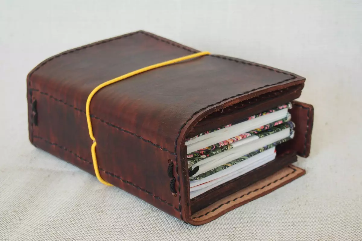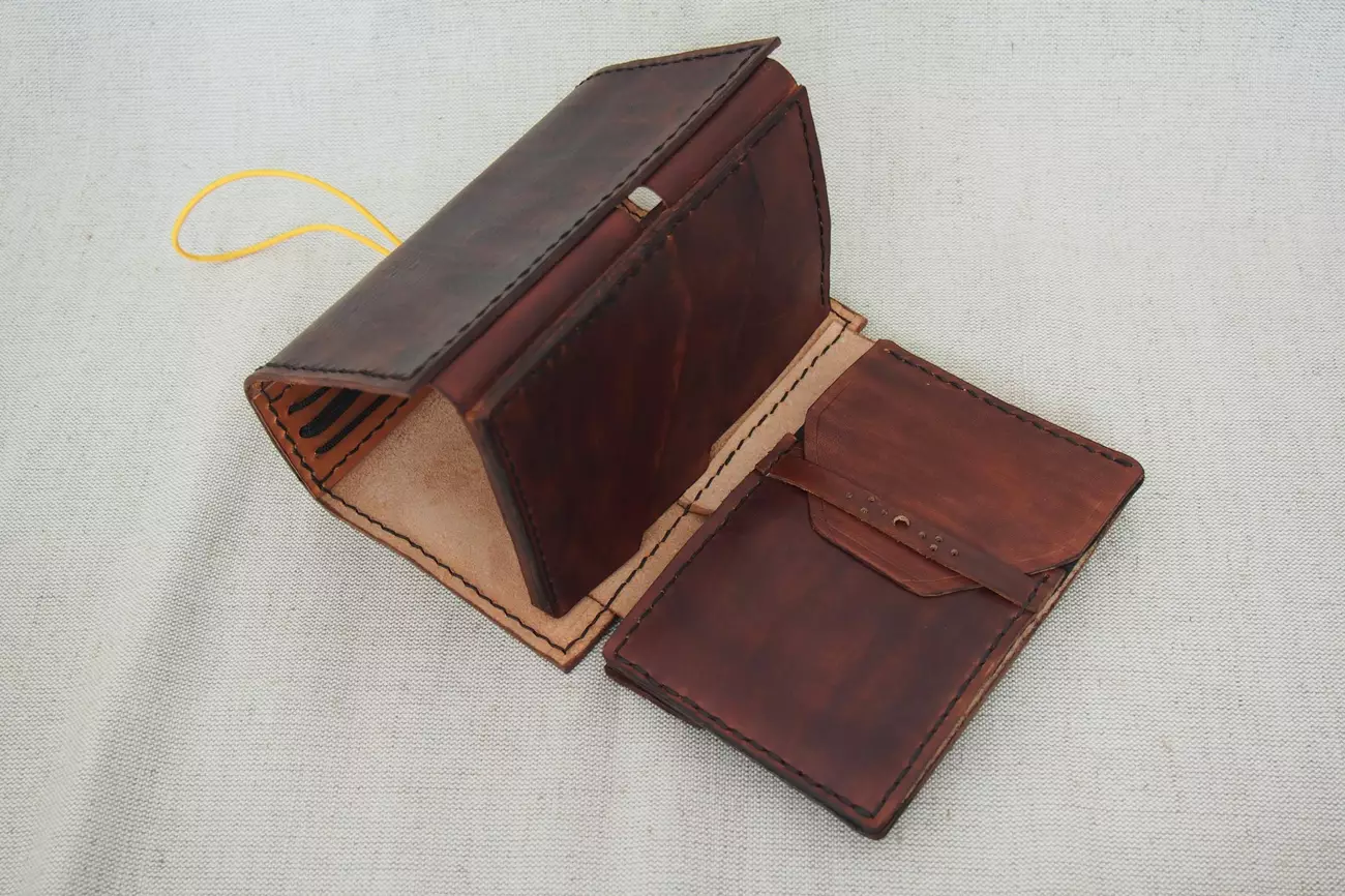 Teraz technikalia. Z wierzchu grubsza i sztywniejsza skóra, na środku wszyty pasek z twardego boku, żeby całość trzymała ładny prostokątny kształt. Wewnętrzne zakładki wykonane z cienkiego i giętkiego boku, po ostatnich zakupach już całkiem fajnie mogę dobierać kawałki o odpowiednich właściwościach nawet na większe powierzchnie. Kieszonki wewnętrzne w skrzydełkach mają wkładki z cieniutkiej skóry garbowanej chromowo, reszta to skóry garbowane roślinnie juchtowe i blankowe. Skóra farbowana, a następnie pokryta tą moją olejno-woskową miksturą (wosk pszczeli, olej kopytkowy, lanolina i inne). Krawędzie wygładzone papierem ściernym, pofarbowane, polerowane drewienkiem i gumą tragakantową (farba zawsze przed gumą, bo wypolerowana krawędź słabo chłonie płyny i kiepsko się farbuje).