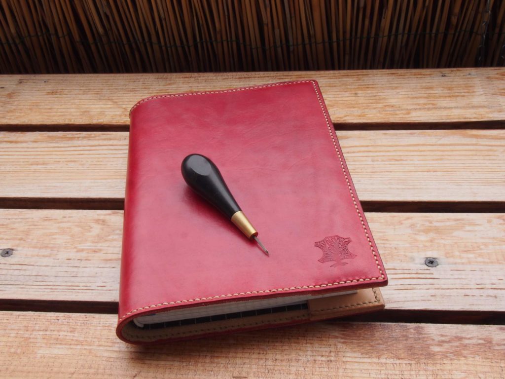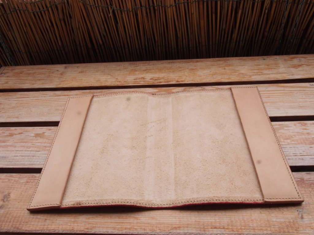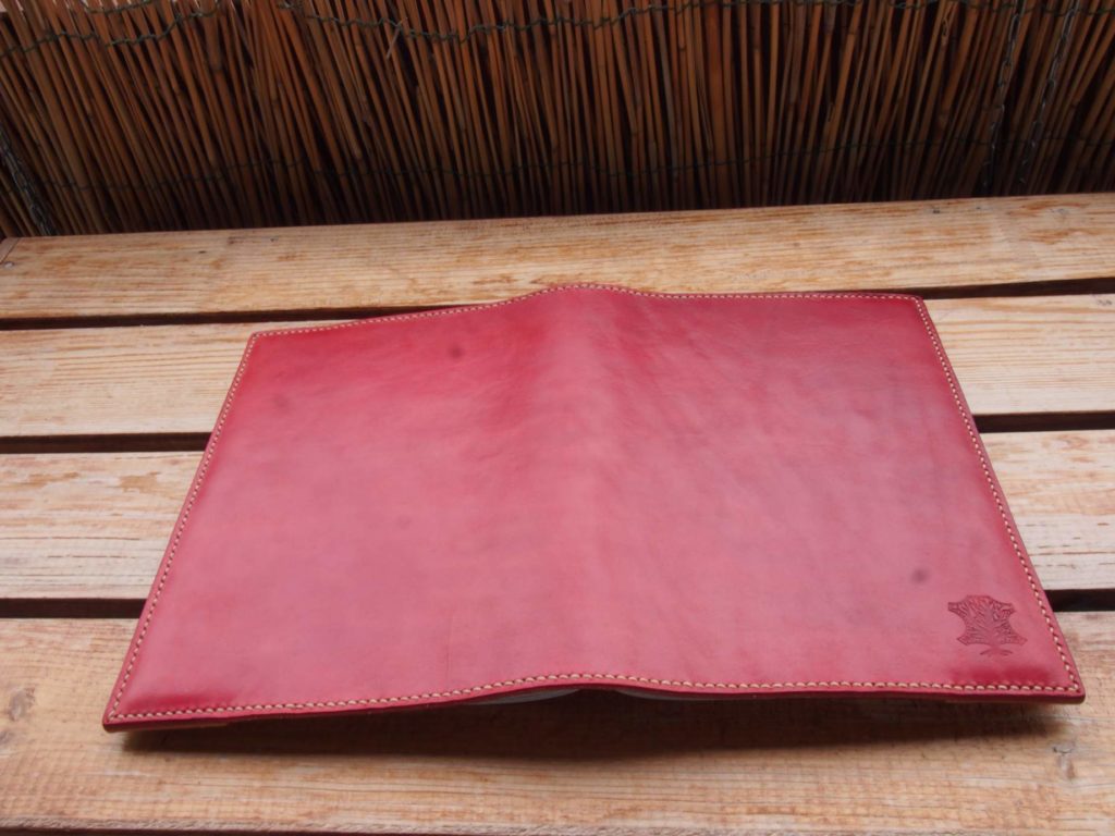 Na okładkę wykorzystałem standardowo skórę garbowaną roślinnie. Grubość solidna bo okolice 3mm, dzięki temu ten przedmiot przetrwa długie lata. Wewnętrzne zakładki wykonałem z tej samej skóry, co część główna, ale nie farbowałem ich. Okładka została zabarwiona na czerwono farbą Kenda. Na wierzch poszła naturalna mieszanka tłuszczowo-woskowa, dzięki temu lico nie pociemniało i zostało dodatkową ochronę przed czynnikami zewnętrznymi. Woski (pszczeli, lanolina i carnauba) to nietoksyczne i naturalne składniki. Powodują one, że woda i zabrudzenia nie mogą tak szybko wnikać w skórę w przypadku bezpośredniego kontaktu. A w dodatku dają całkiem przyjemny, satynowy połysk lica po porządnym wyszczotkowaniu.