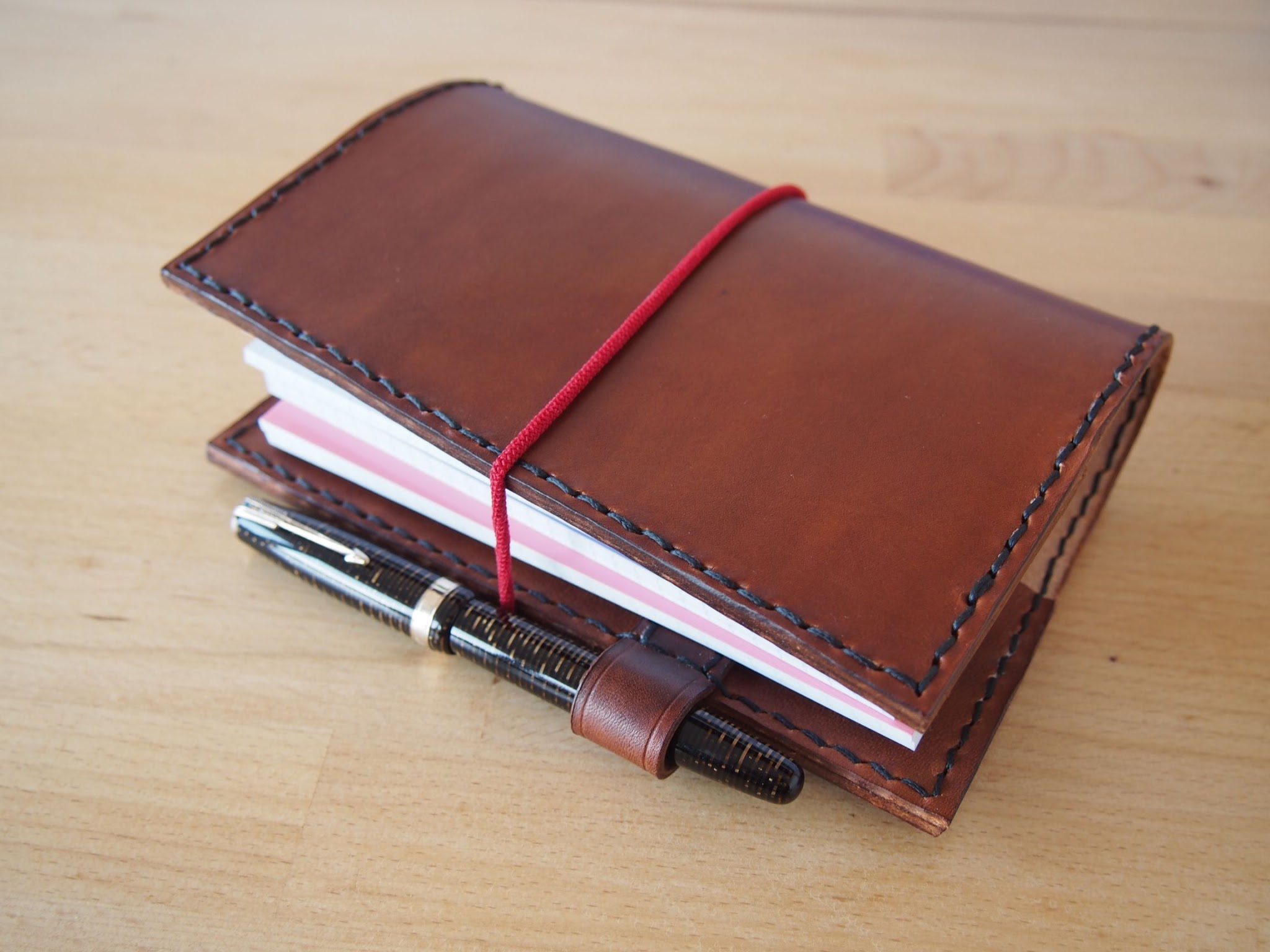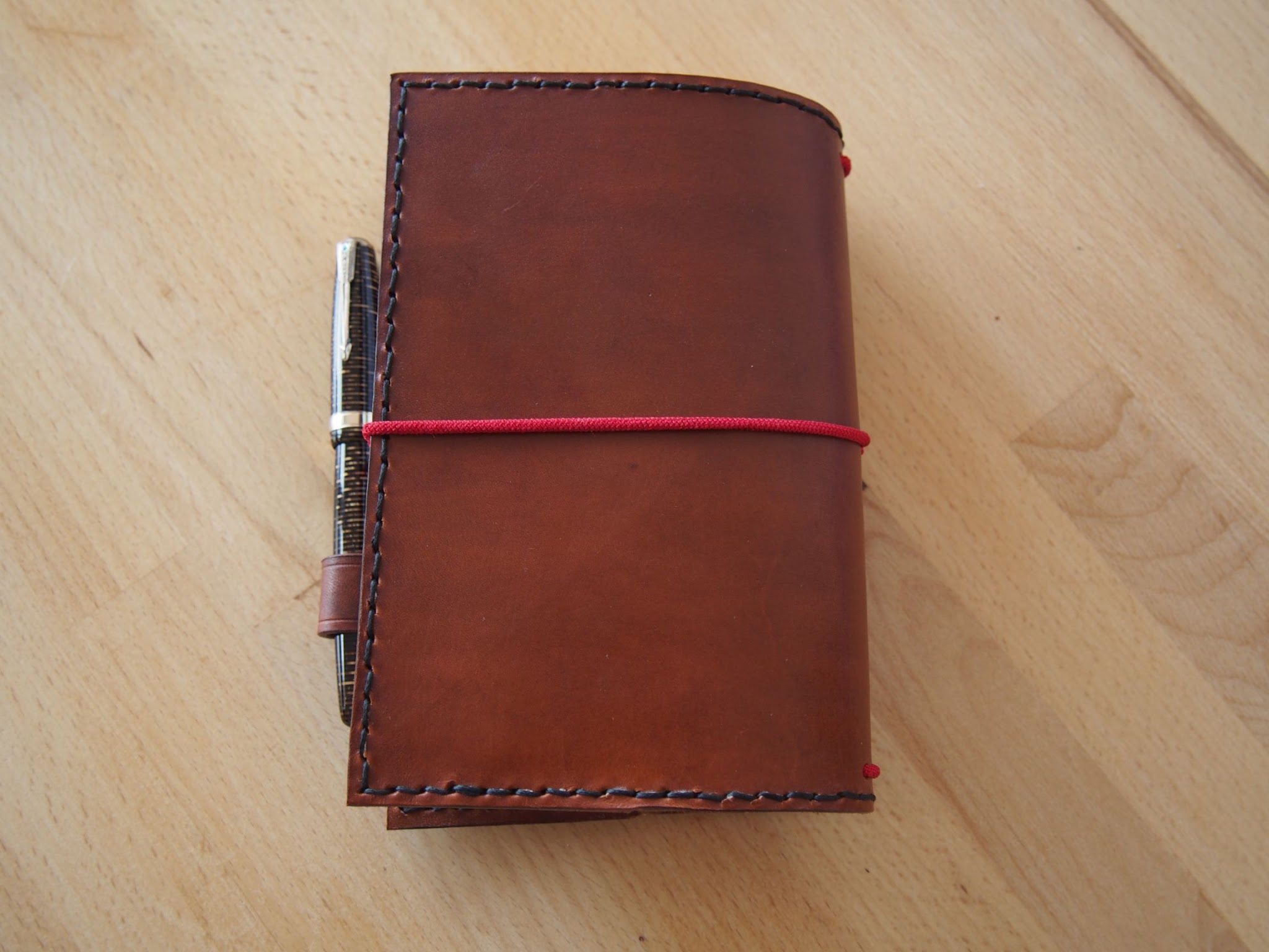 Dzisiaj zaczynam pracę nad okładką pod konkretne zamówienie. Ma mieścić 4 notatniki A6, mocowane na gumkę, mieć praktyczne zakładki w standardzie no i ten brąz, co na ostatnim pasku od zegarka. Całość wykończona przeszyciem na całym obwodzie. Planowana zawartość to 4 Oxfordy i możliwość zamontowania Moleskina w przyszłości.