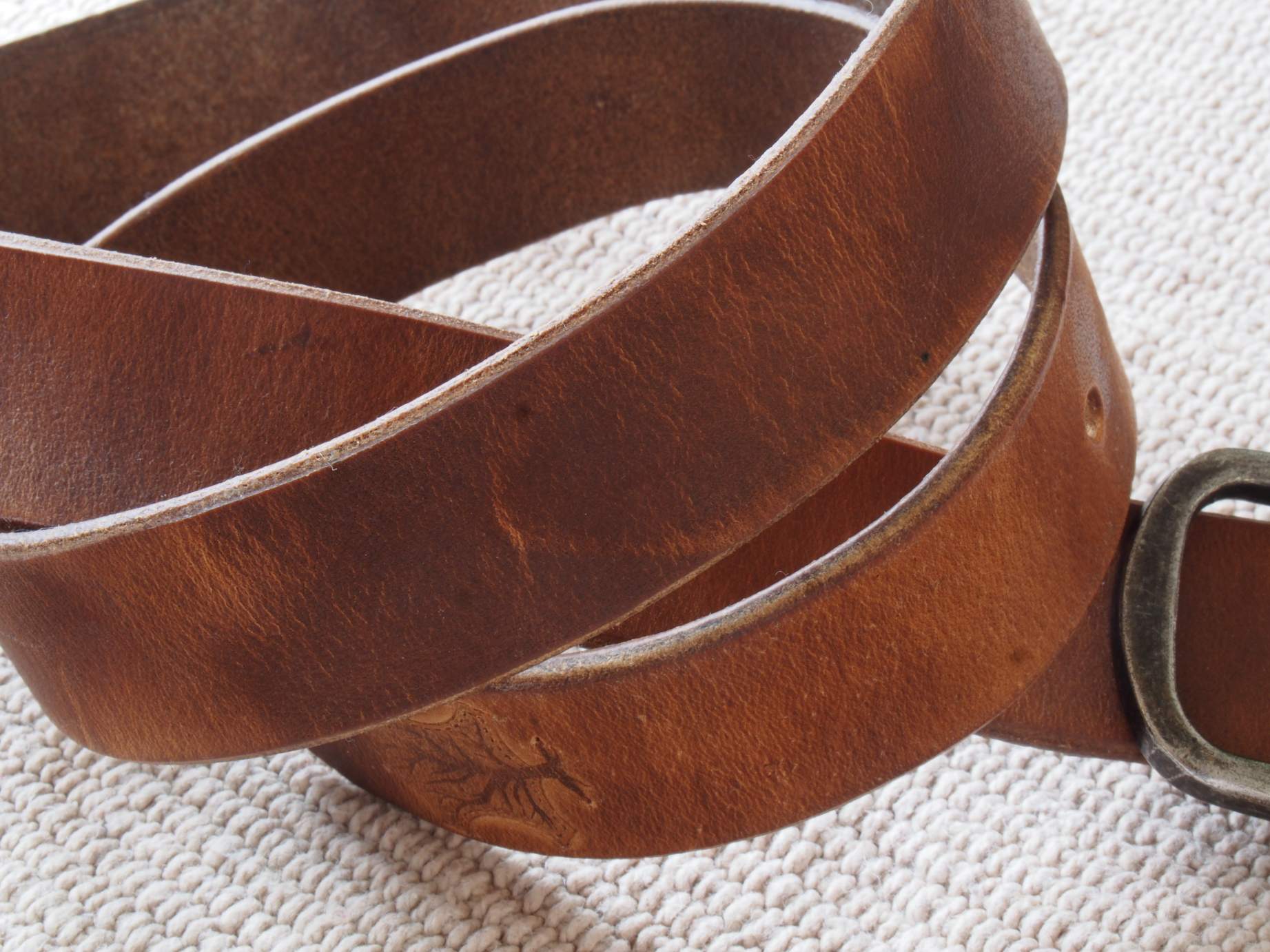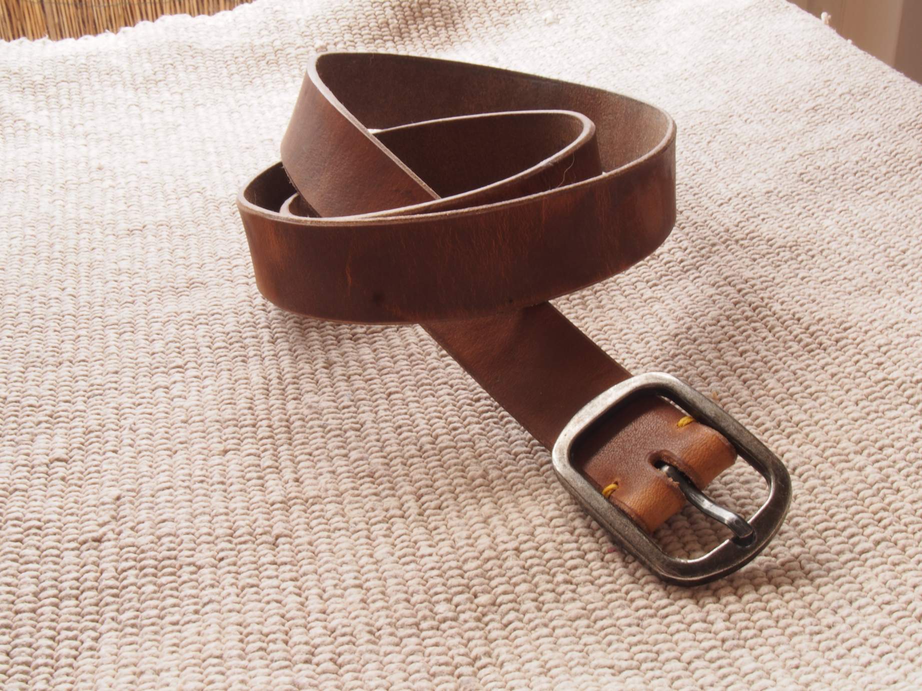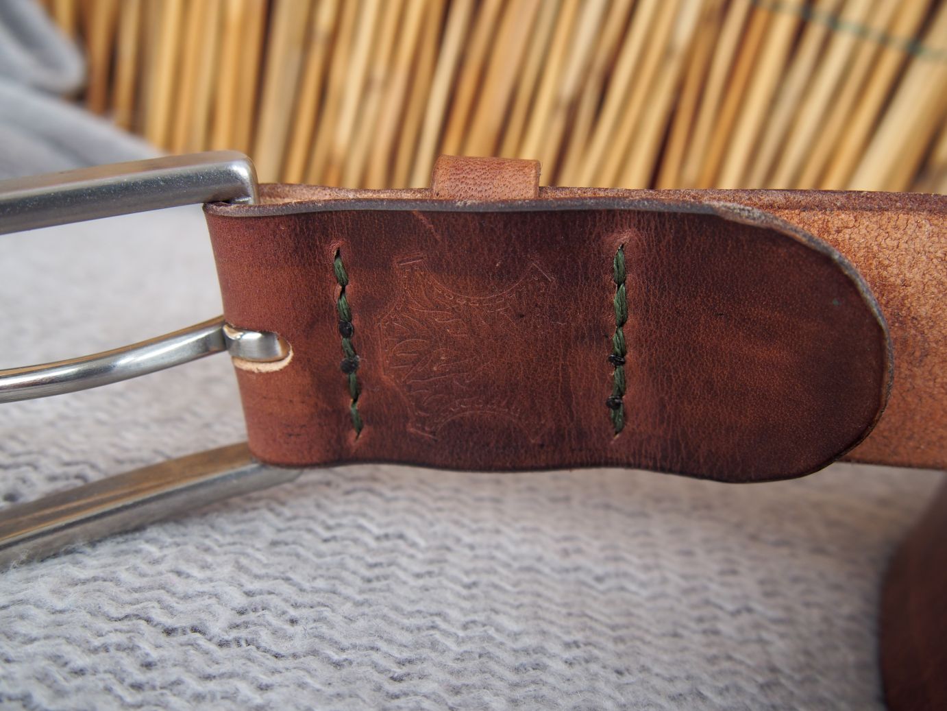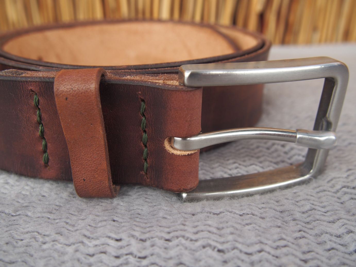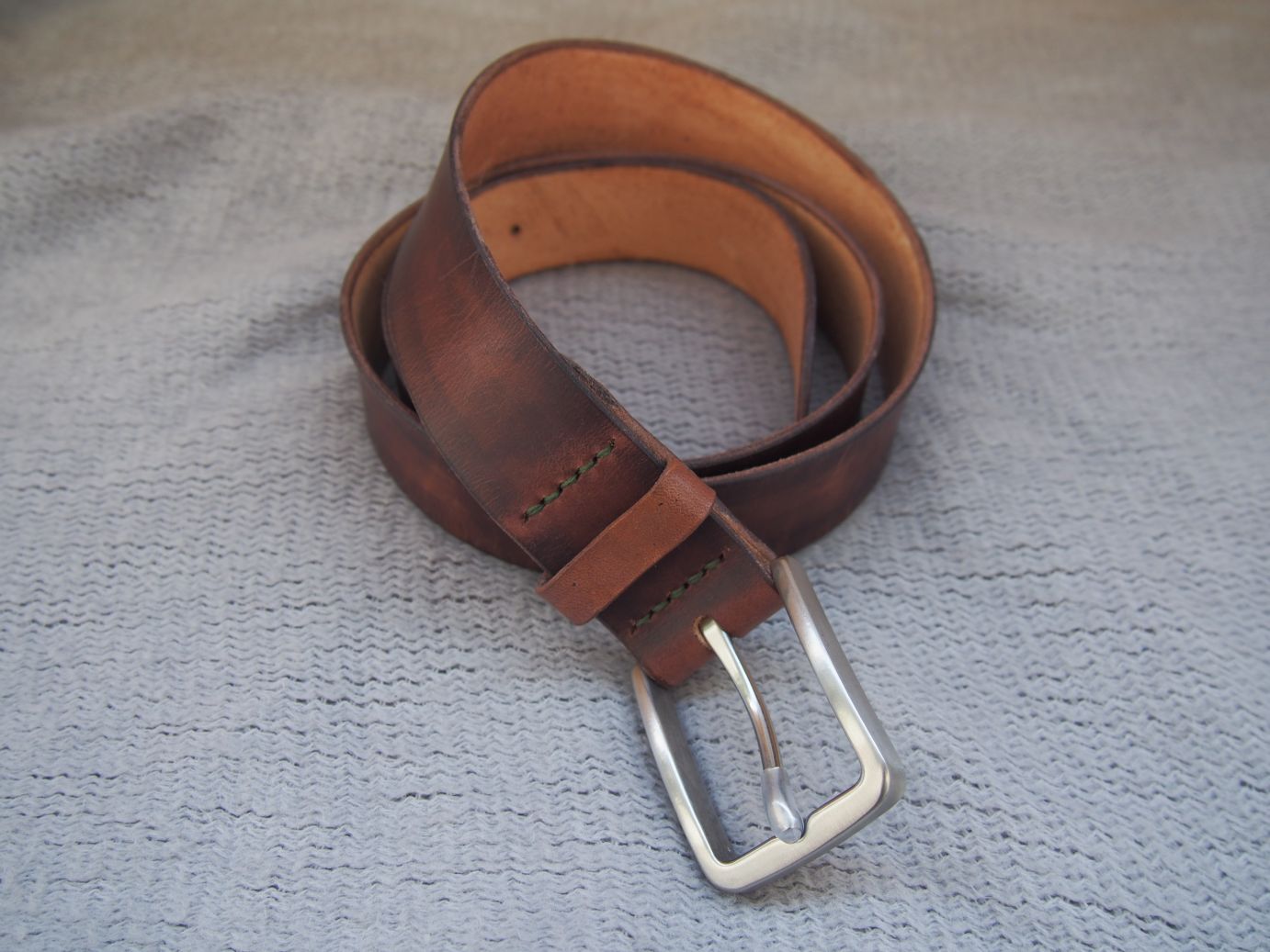 2020-05-14 Bazując na modelu paska z tego posta, zrobiłem podobny. Również solidnie woskowany, ale już bez zanurzana w wosku, bo nie miał być taki sztywny. Zastosowałem też wysokiej jakości klamrę ze stali nierdzewnej oraz zielone przeszycie, które ciekawie komponuje się z tym odcieniem brązu.