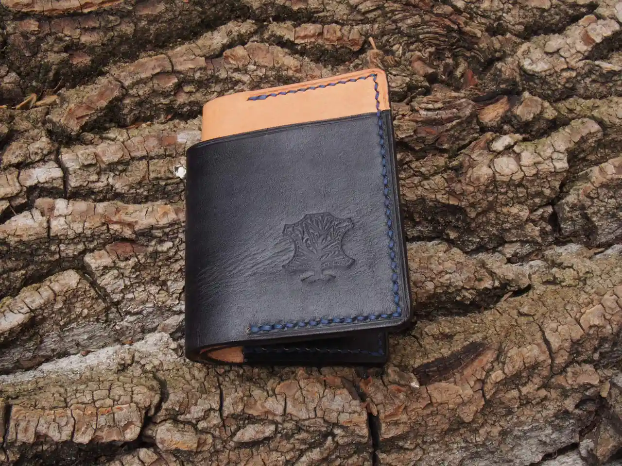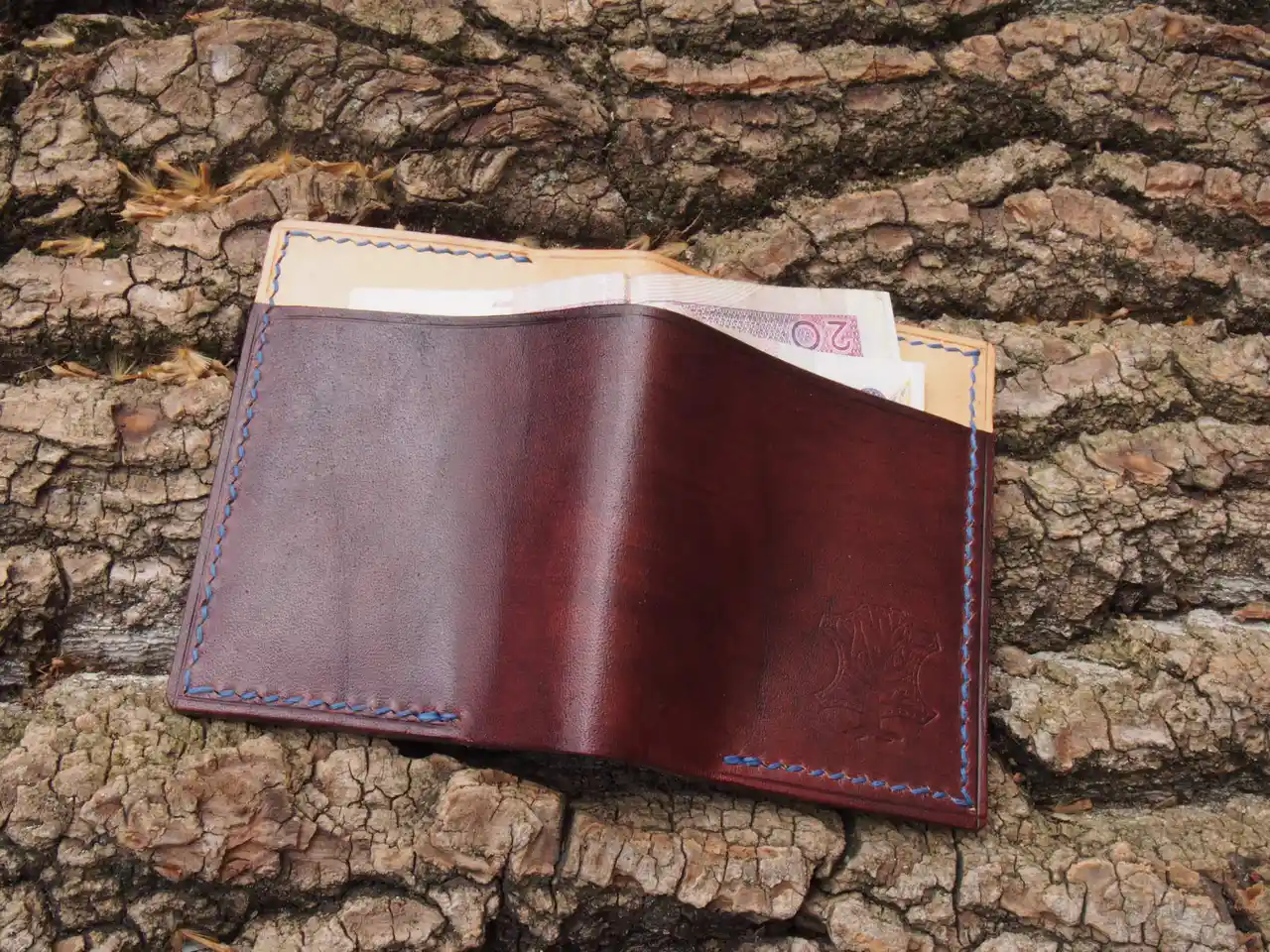 Portfele różnią się szczegółami tu i tam: widać, że koncepcja delikatnie ewoluowała podczas wykonywania kolejno 4 sztuk. Oprócz czarnego, wszystkie są ze skóry garbowanej roślinnie grubości 1,5- 2mm. Czarny różni się tym, że ma tą niefarbowaną część ze skóry o grubości 3mm. Skórę barwiłem przy pomocy EcoFlo Waterstain Bordeaux, Black, Blue i Green. Przeszycia zielonego i czarnego portfela zrobiłem nićmi 0,8mm, brązowego 0,6mm, niebieskiego 0,4mm. Z grubością nici jeszcze muszę poeksperymentować, bo nie zdecydowałem się, który szew wygląda najlepiej. Rozstaw dziurek to 3,85mm i taki zamierzam zostawić na stałe. Brzegi ozdobiłem przy pomocy liniarki. Krawędzie wyszlifowałem papierami ściernymi, zafarbowałem na ten sam kolor, jaki miały inne elementy portfela i wygładziłem drewienkiem na mokro. W następnych edycjach będą kolorowe krawędzie. Tam gdzie spotykają się 3 warstwy skóry planuję zrobić na krawędzi „przekładańca” np. czerwony, naturalny, czerwony. Lico zabezpieczyłem mieszanką woskowo-tłuszczową, ale nawet mimo tego portfele nie lubią się za bardzo z wodą. Uroki skóry garbowanej roślinnie. W zamian coś bardzo cennego – piękna patynka, która będzie widoczna już po około 6 – 8 miesiącach.