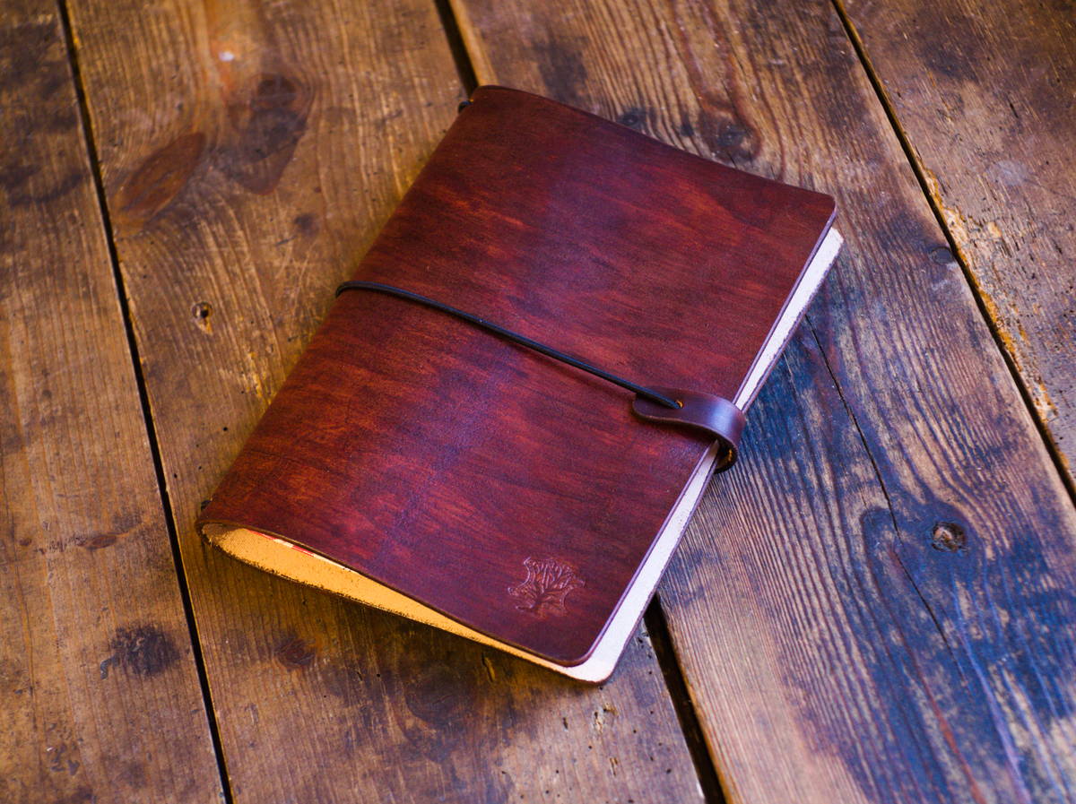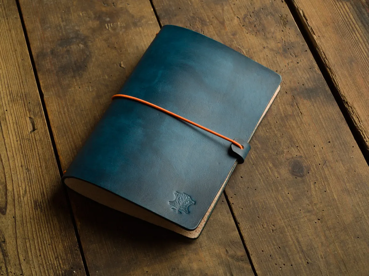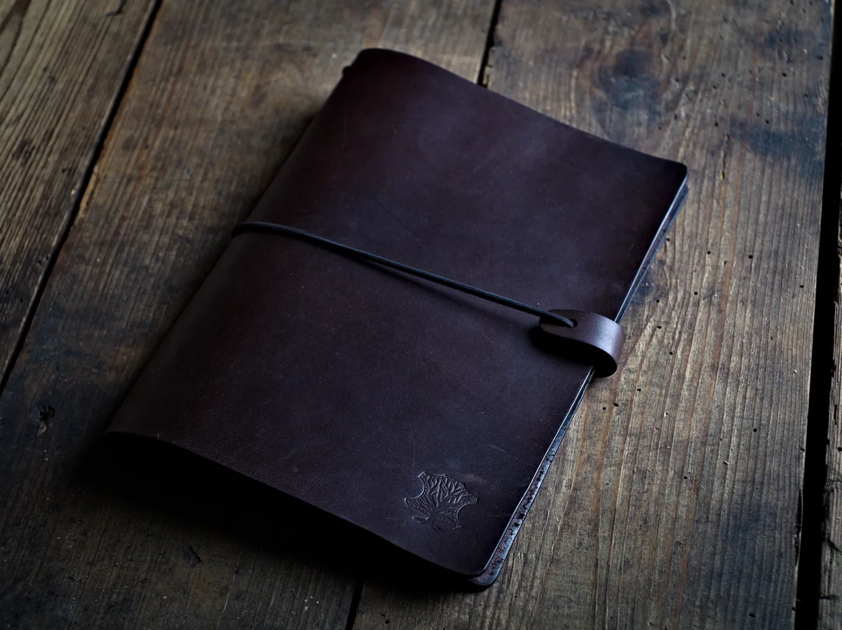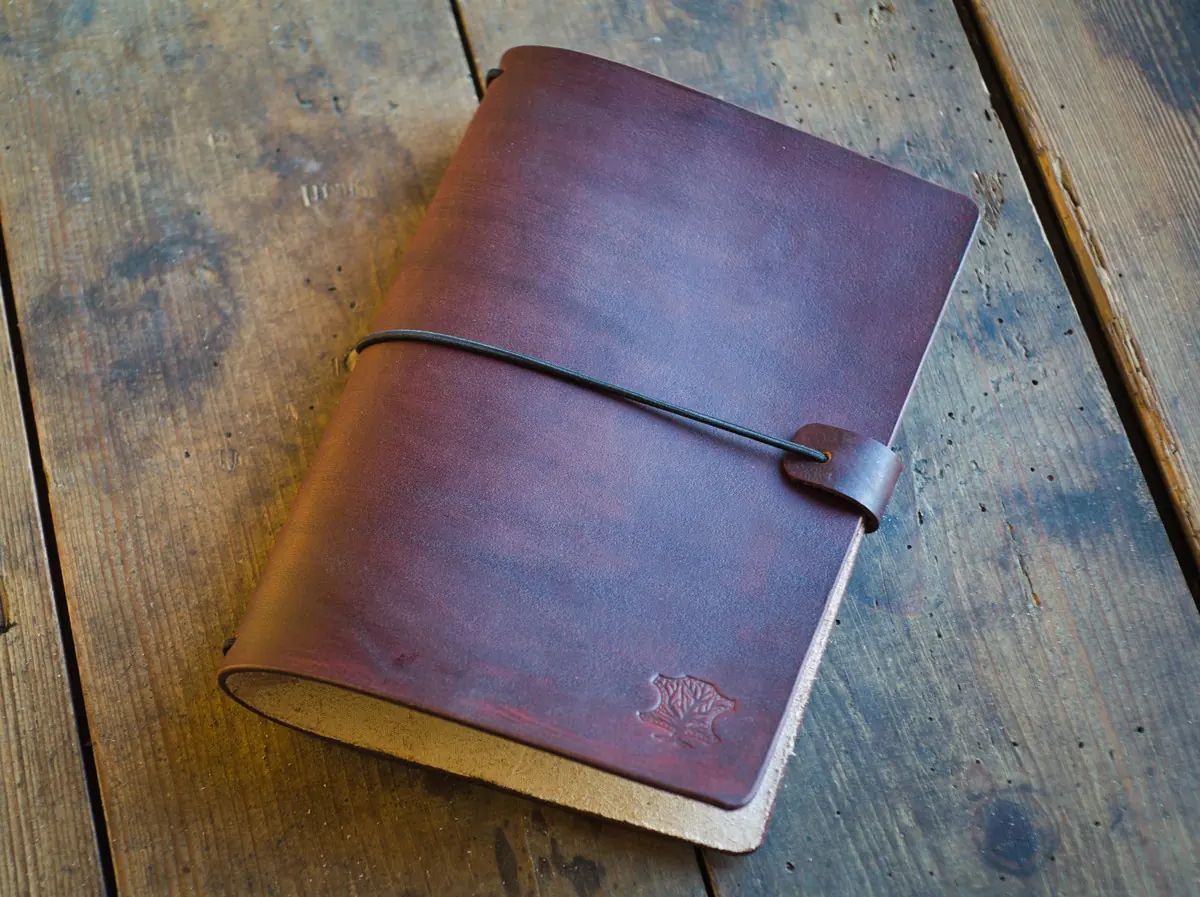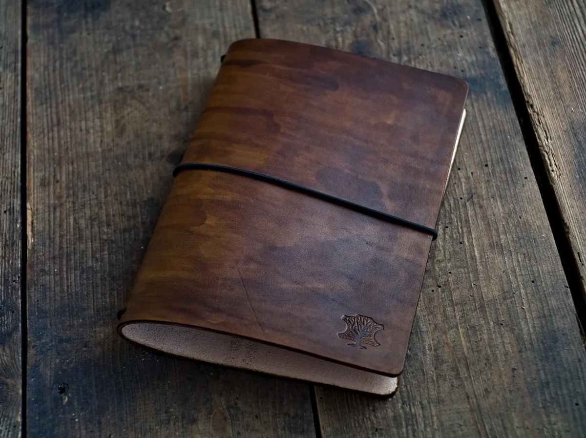 Skórzana okładka typu notes podróżnika, znany również pod nazwami okładka midori lub traveler’s notebook. U mnie w wydaniu z porządnej, skóry garbowanej roślinnie wyprodukowanej w Polsce.