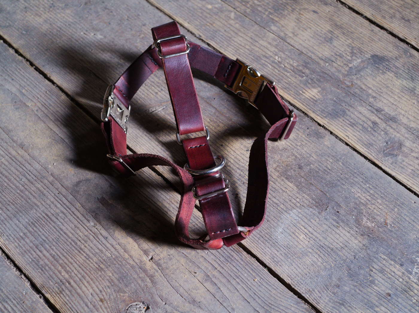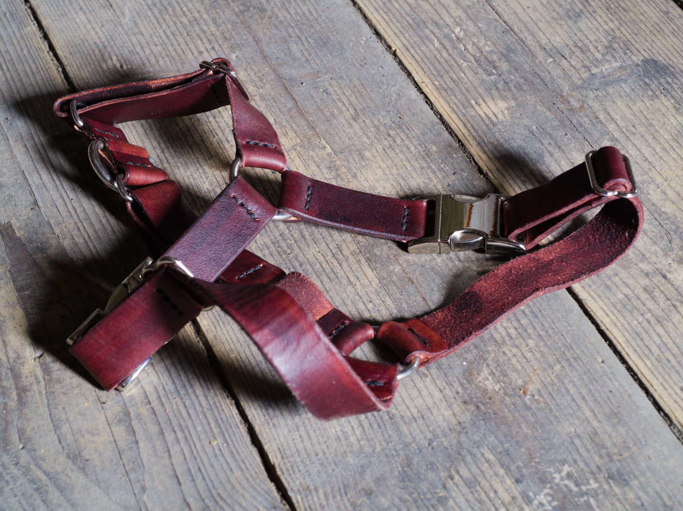 Trwałe skórzane szelki dla psa wykonane na wymiar. Skóra garbowana roślinnie, w pełni ręczne wykonanie, czyli wycinanie elementów, farbowanie, przeszycia, montaż. Skóra porządnie nawoskowana i natłuszczona w celu zabezpieczania przed wilgocią.