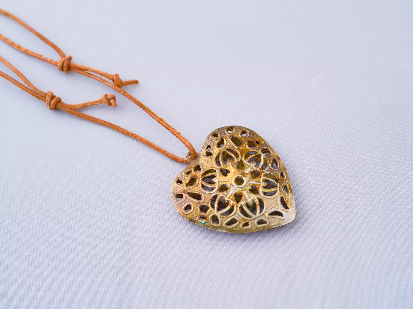 Wisiorek ażurowe serce wykonane z metalu, upolowane na targu staroci, zawieszone na naturalnym rzemieniu od polskiego producenta. Serce ma ok. 4,5 cm wysokości i jest dwustronne z pustą przestrzenią w środku, z obu stron wygląda tak samo.
