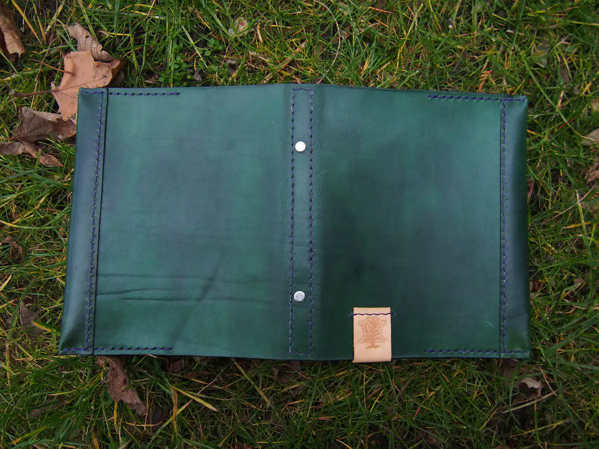 Całość okładki wykonałem ze skóry garbowanej roślinnie, główną część z kawałka o grubości około 3 mm. Przyciąłem ją na trochę mniejszy wymiar niż potrzebowałem, żeby jeszcze zostało miejsce na zakładki. Te są zrobione ze znacznie cieńszej skóry o grubości ok. 2 mm pochodzącej z boku bydlęcego, żeby nie dodawać wagi okładce. Usztywnienie to ponownie skóra 3 mm. Do tego projektu użyłem farby Eco Flo Waterstain w kolorze, jak widać na fotkach, „Green”. Przeszycie z rozstawem dziurek 6,5 mm, nici to fioletowy Slam 0,8 mm. Mechanizm segregatora przymocowałem chromowanymi nitami skręcanymi. W razie zużycia można będzie łatwo wymienić mechanizm na nowy. Poza tym miały dokładnie taki sam kolor jak mechanizm. Obróbka krawędzi dość standardowa, przeszlifowałem je papierami ściernymi, wygładziłem drewienkiem i wodą, a na koniec nawoskowałem. Lico skóry zabezpieczyłem swoją mieszanką woskowo-tłuszczową i wypolerowałem ewentualne osady wosku miękką ściereczką. Dzięki temu okładka nabrała eleganckiego, satynowego połysku.