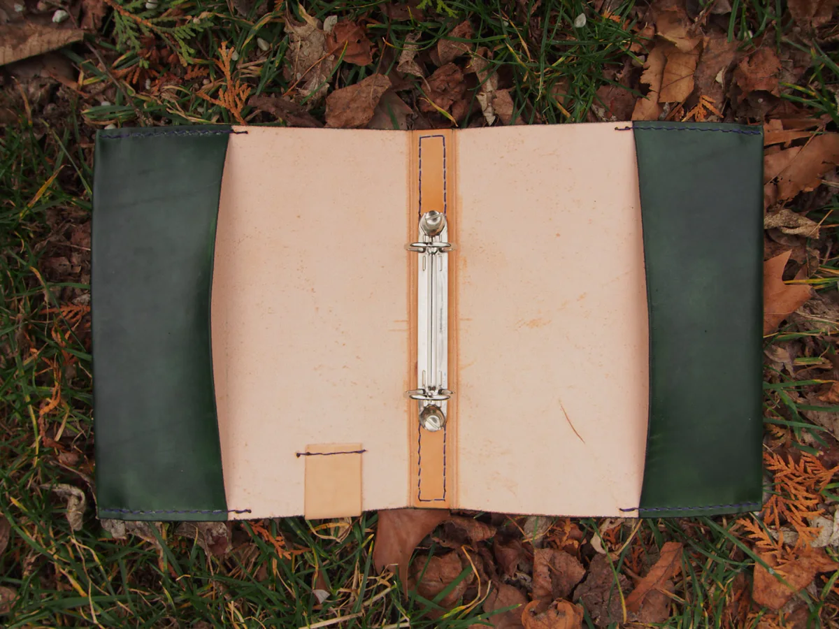 Okładka mieści standardowy mechanizm segregatora A5. Ma usztywnienie grzbietu oraz ciekawe, częściowo naszywane zakładki z cieńszej skóry. Dzięki temu są lekko rozciągliwe i mają większą pojemność.